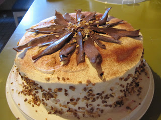 Tämmöisen kakun pyöräytin tuossa äitienpäivän aikaan. Äitini tätä itse halusi, ja resepti oli kyllä haastava, mutta onnistui mahtavasti. En suosittele reseptiä aivan aloittelijalle, sillä paahtokermahyytelön kanssa on oltava tarkka. Mutta oli tämäkin vasta ensimmäinen kohtaamiseni kyseisen seoksen kanssa. Tämän kanssa on kyllä oltava aikaa, itselläni meni kakun tekemiseen aimo tovi. En ollut ennen tehnyt 4 kerroksista kakkua, ja tämä kakku olikin vähän vinossa, leikkaamistaitojeni takia. Mutta harjoittelemalla sekin hioutuu. Ilman muita jorinoita, tässä resepti :